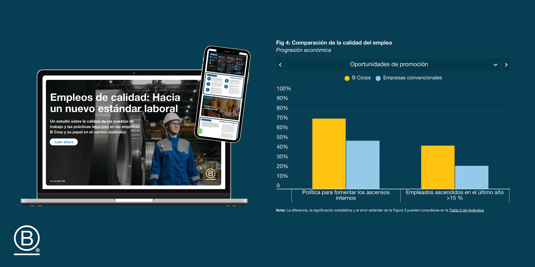 Crecimiento profesional y formación: La apuesta por el talento es casi universal en la comunidad B Corp: el 99% de las B Corps ofrece formación a las nuevas incorporaciones y el 96% proporciona programas de capacitación basados en competencias. Estas empresas también duplican la promoción interna frente al tejido empresarial general: el 44% ha ascendido a más del 15% de su plantilla, frente al 23% de las empresas convencionales.