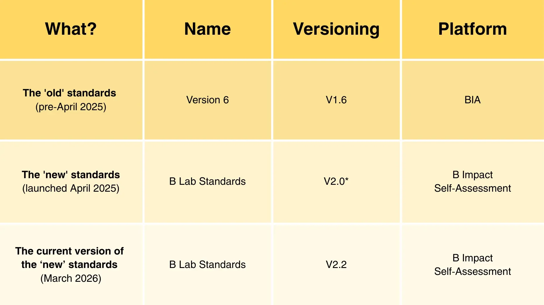 *Los nuevos Estándares de B Lab (publicados entre el 8 de abril y el 11 de agosto de 2025) se consideran formalmente V2, teniendo en cuenta que en la versión descargable en PDF de los nuevos Estándares publicados en ese momento se hacía referencia a ellos como V1.